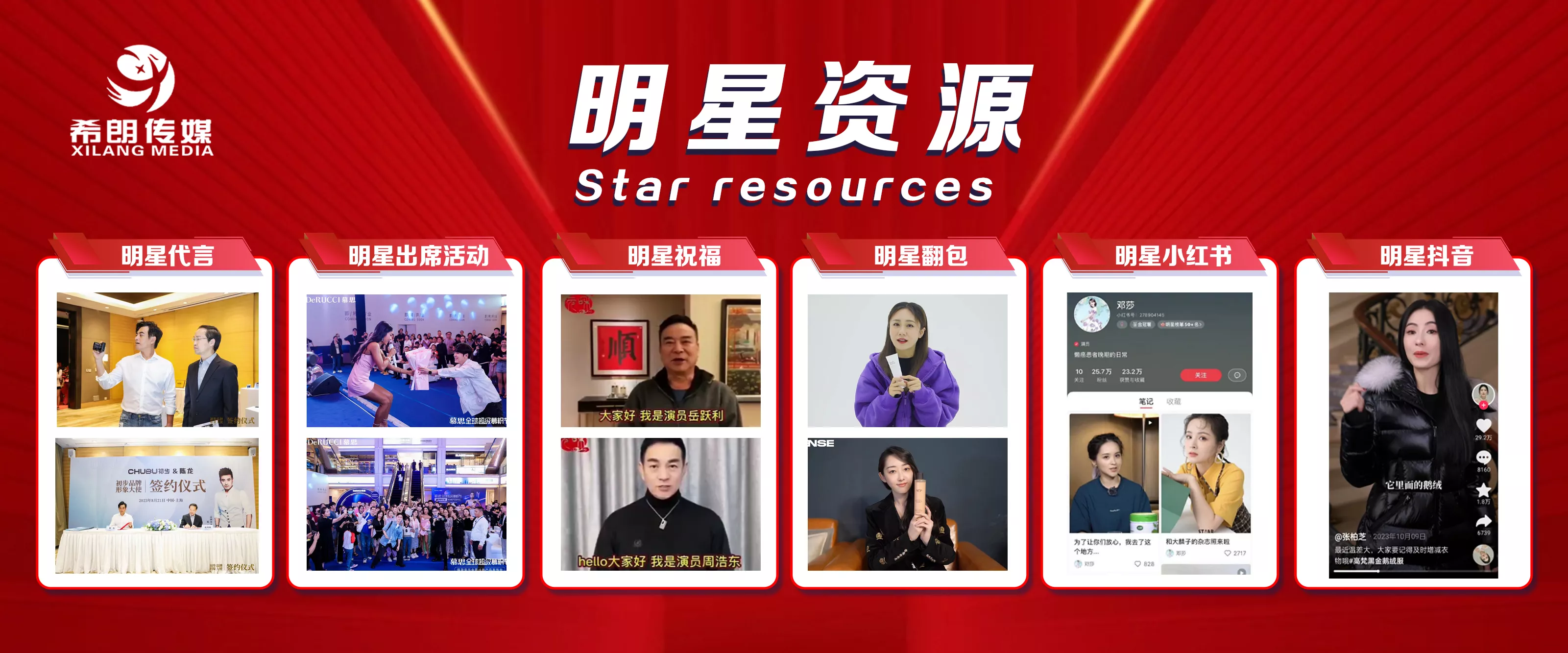 明星资源: 明星代言、 明星好物推荐(明星种草)、 明星祝福、 明星商演、 明星新媒体合作(小红书、抖音、微博、直播)